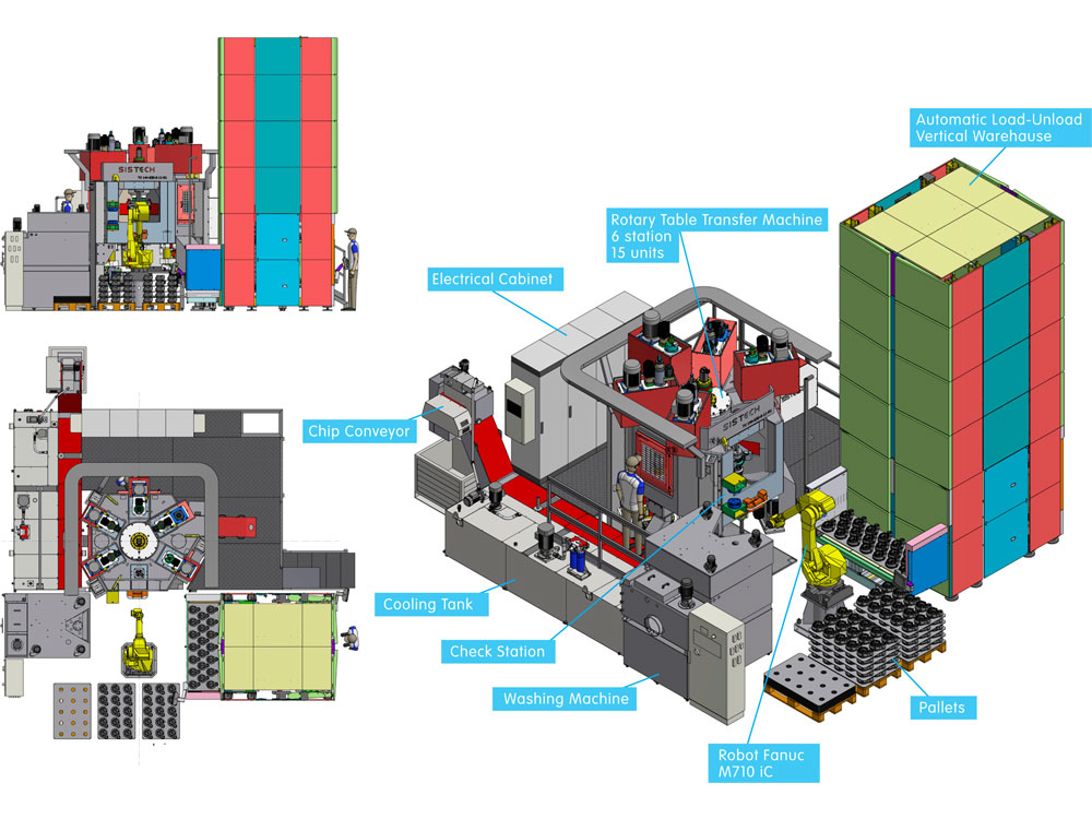 Le isole a richiesta vengono completate con robot antropomorfi, magazzini portapezzi, impianti di lavaggio, sistemi di connessione alle linee di montaggio.